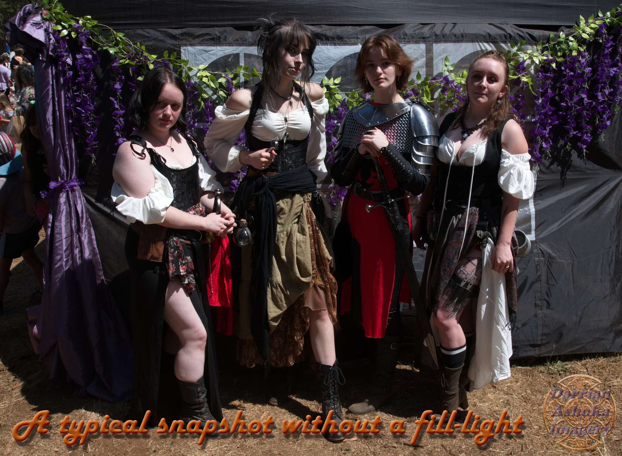 example to demonstrate the difference. Taken in daylight when my flash had misfired (my strobes in inactive-power-save mode) ![]() ![]() I then quickly retook the shot before this group of gals departed, after my lights were ready. On the right is a cropped image from the same original image to the left, to show more detail, which I am able to do with such hi-rez image files. (remember, you can click on any of these images to see a larger version) ![]() ![]() You can see here how the shadows are less harsh and the colors are more vibrant. The type of lighting I used is shown in the reflection within their eyes; with a pair of bright dots to each side of their puples. A center on-camera strobe would show a single dot in the center of their puples, and is what causes that red-eye problem you see in so many amature photos. |